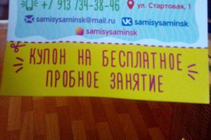 «САМИ С УСАМИ» студия раннего развития Подготовка к школе индивидуально и в группах Группа неполного дня с 2 лет Английский язык Группы раннего развития с 9 месяцев +7 923 253-12-38 ул. Галущака, 4 +7 913 734-38-46 ул. Стартовая, 1 samisysaminsk@mail.ru vk samisysaminsk instagram samisysaminsk Купон на бесплатное пробное занятие